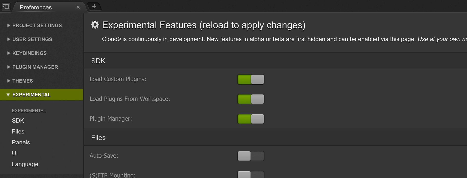 Go to your Cloud9 Preferences and enable all 3 Experimental SDK toggles.