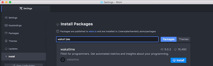 Alternatively, you can install WakaTime from command line with apm install wakatime.